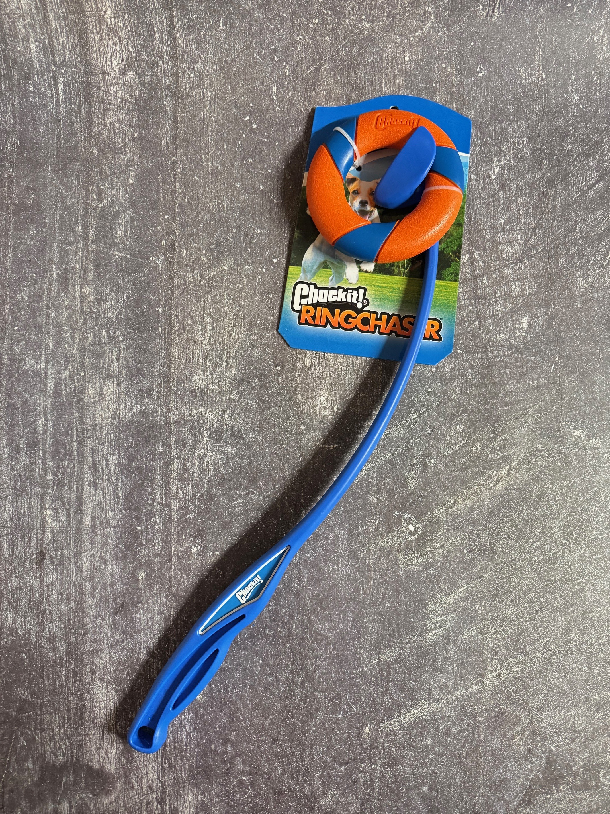 Mit dem robusten ca 56cm langen Werfer kann der Ring direkt vom Boden aufgenommen werden.