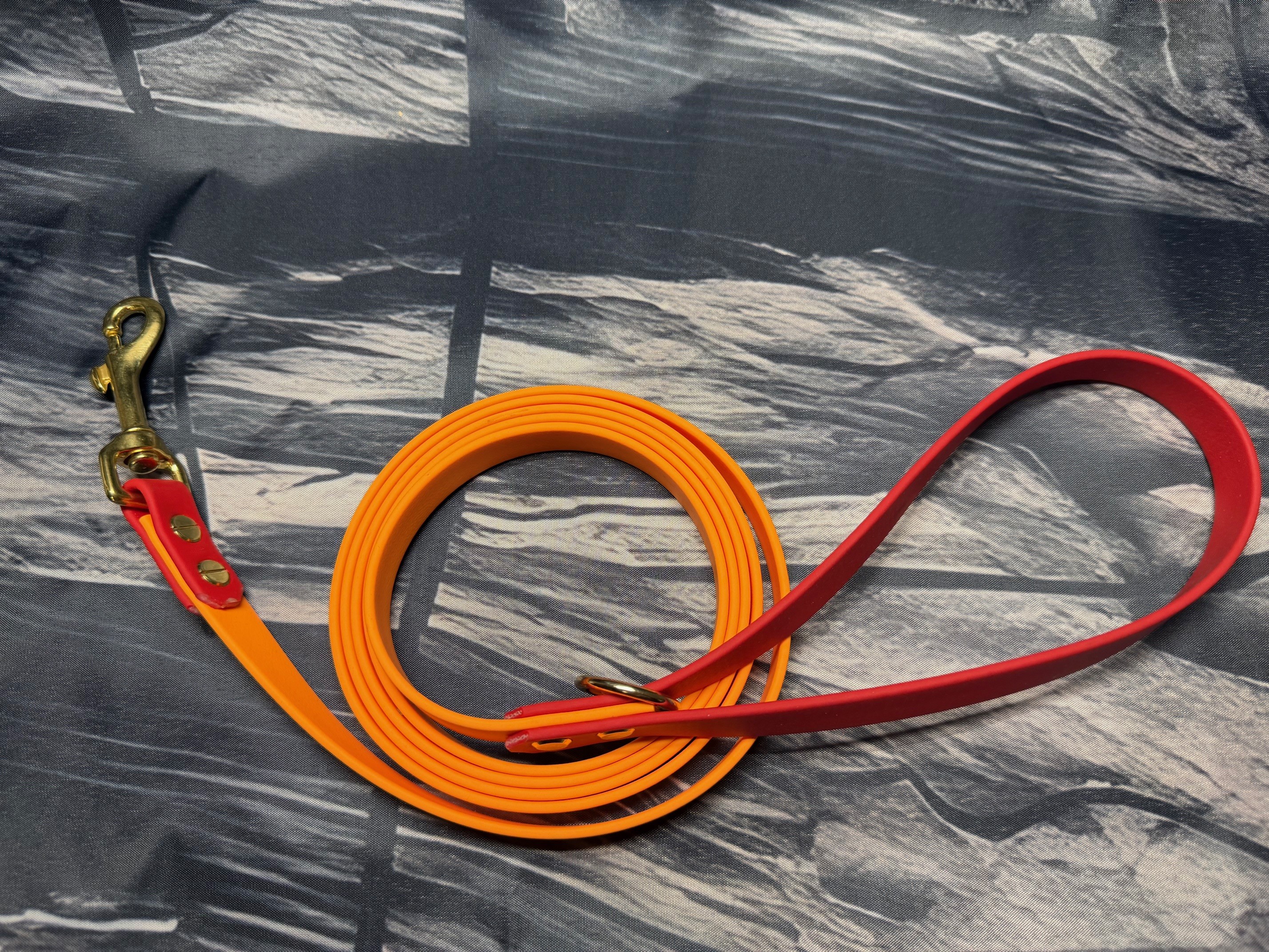 Führleine zweifarbig , 16 mm , 200 cm , Biothane Peach und Rot , Hardware Messing